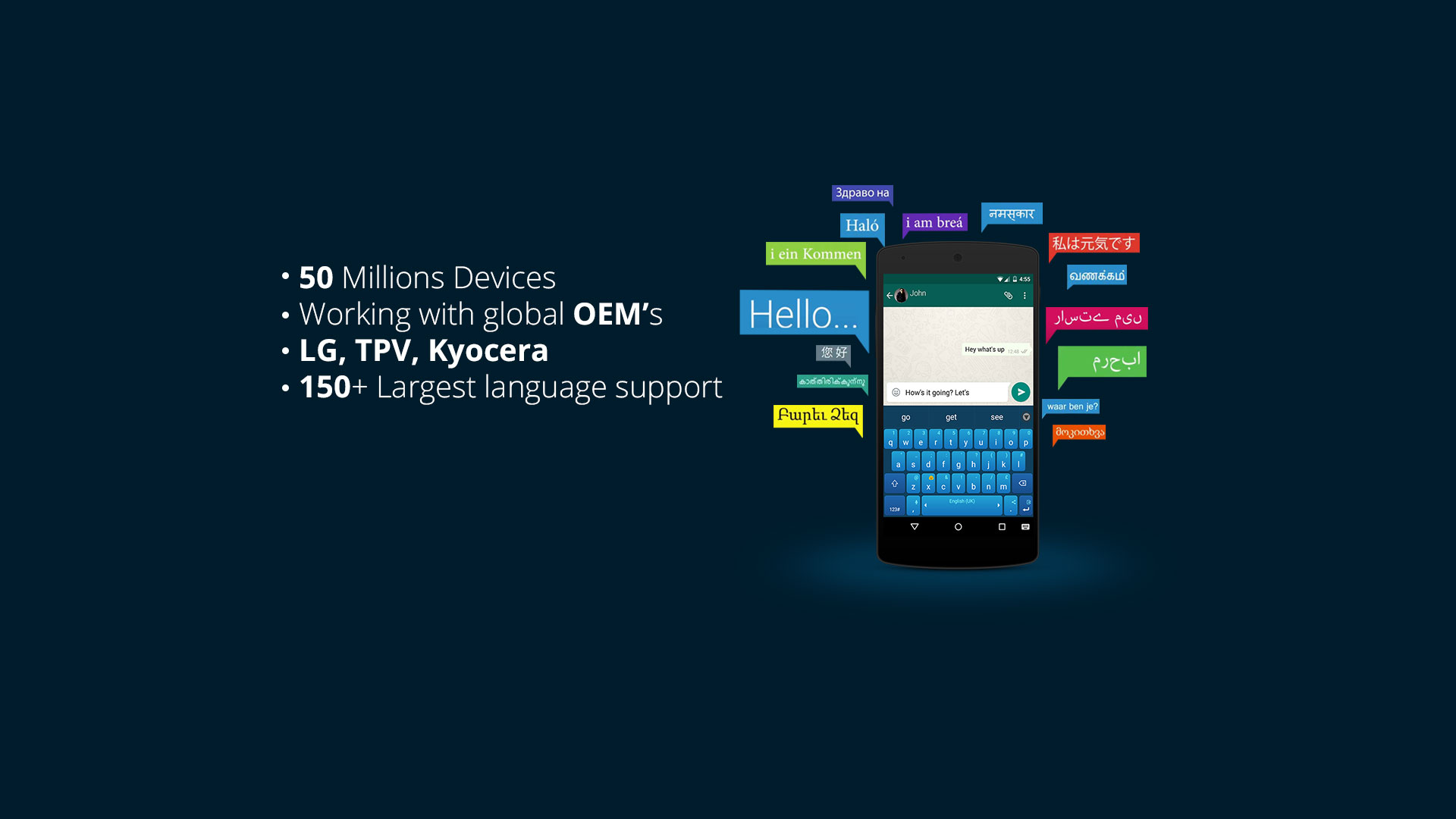 We love our 50 Million users who use Adaptxt for their daily text entry needs on their smartphones and enjoy some of the unique features that the product offers such as 12 key support, global language coverage, language specific layout, contextual prediction quality to name a few. We are the pioneers in forging strategic partnerships with device manufacturers and OEMs to provide the mobile device users a unique experience powered by the latest innovations in Natural Language Processing (NLP), Artificial Intelligence (AI) and Intent Analysis.
